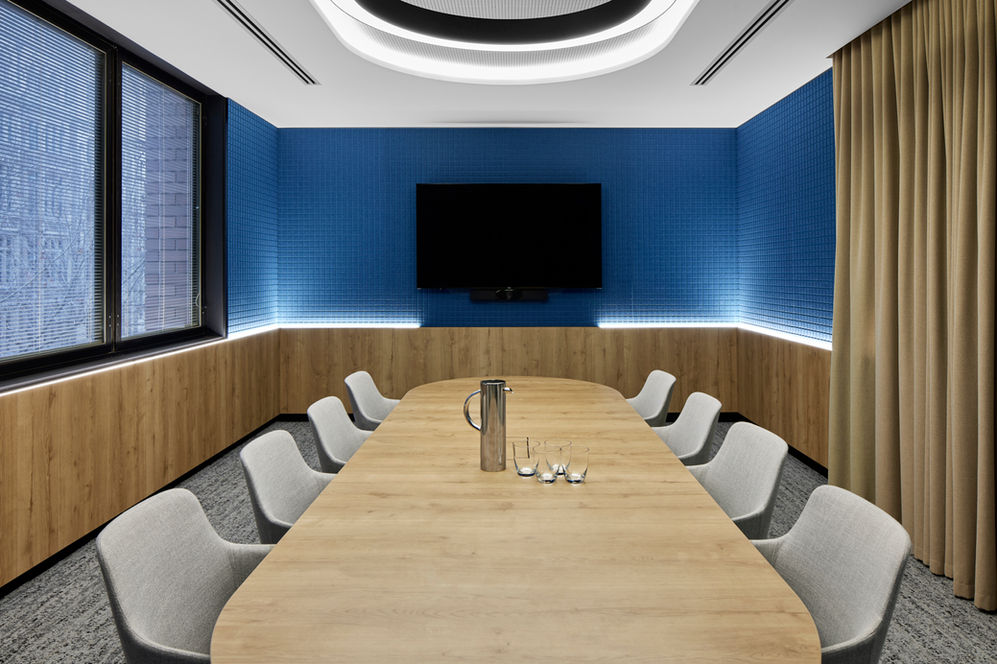 Our clients at this engineering firm aspired to transform their office into a lively and dynamic space that truly represented their team. The introduction of plush, textural carpeting and acoustic panelling bring a much-needed sense of warmth and comfort, contrasting beautifully with vibrant colours and intricate patterns to infuse the space with energy and vitality. The use of innovative lighting techniques also creates a high-tech ambiance and the inclusion of hanging acoustic features reminiscent of mechanical fans pays homage to their engineering roots.